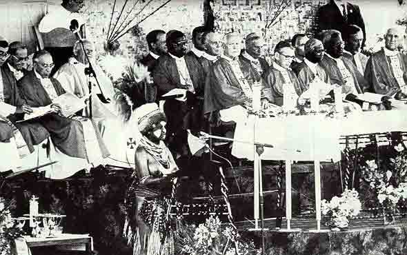 ミサにおいて裸の胸をさらした女性が法皇の前で聖書を朗読する。